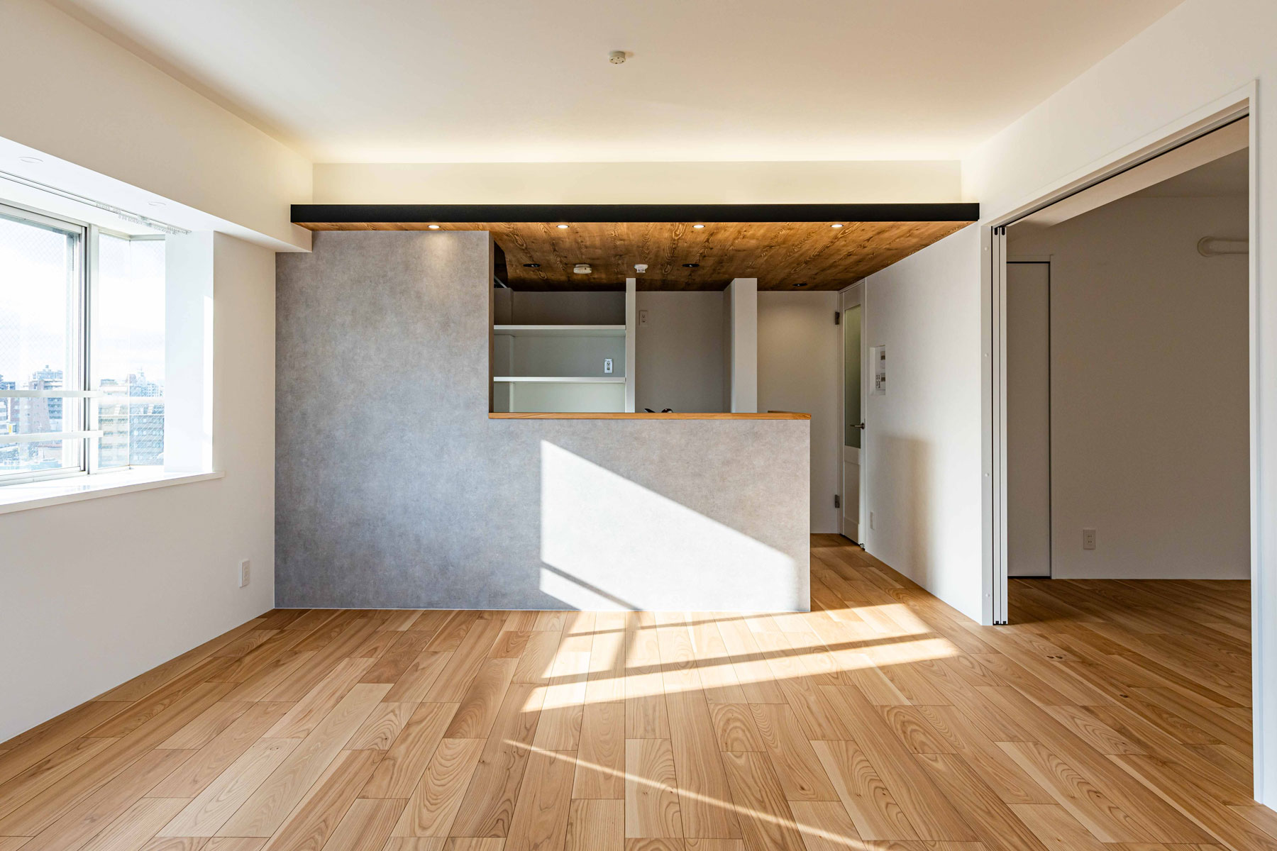 リビングの木目調フローリングと窓から差し込む柔らかな光が、ぬくもりを感じさせる空間を演出。