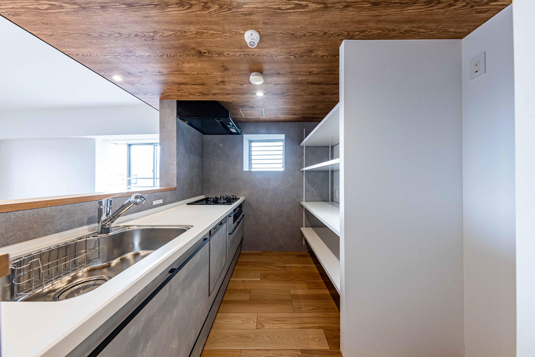 グレーカラーで統一したカウンターキッチンは、シンプルで洗練された印象を与えるとともに、天井高を抑えた設計に木目と黒フレームのコントラストが際立ち、まるでカフェのような落ち着いた雰囲気を演出します。背面には電子レンジやオーブントースターを収納できる棚や多数のコンセントを備え、使い勝手も抜群。デザイン性と機能性を兼ね備え、ストレスのない快適な料理時間を叶えます。