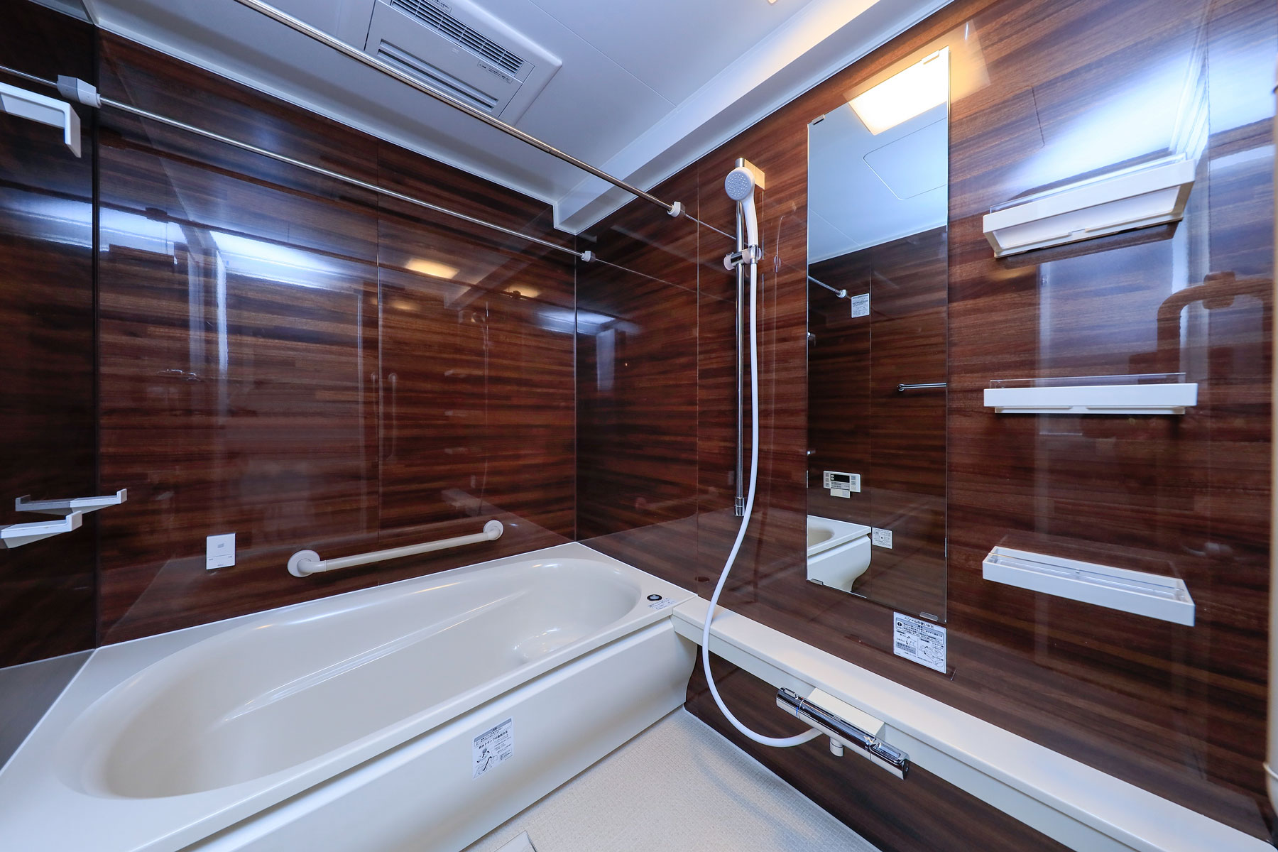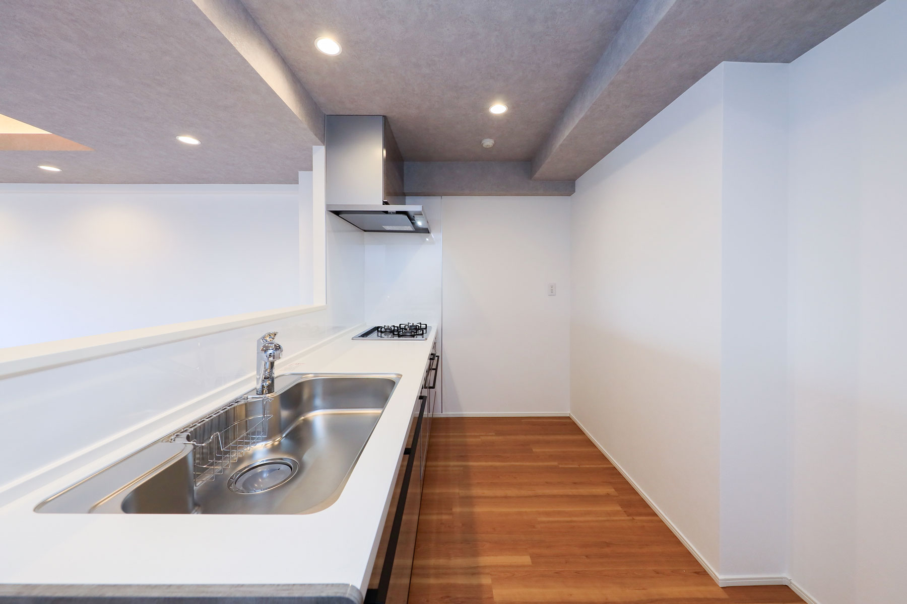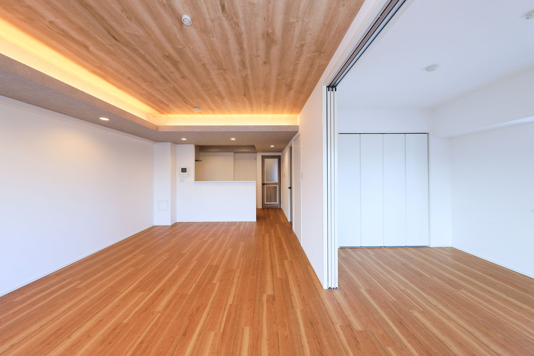 LDKに入ると、木目を進行方向の長手に流したフローリングが視線を導き、奥行きのある空間を演出します。折り上げ天井に施された間接照明がやわらかにゾーンを区切り、特別な癒しのひとときを感じられる設計に。隣接する洋室を開放すれば、一体的に利用できるフレキシブルな居住空間が広がります。