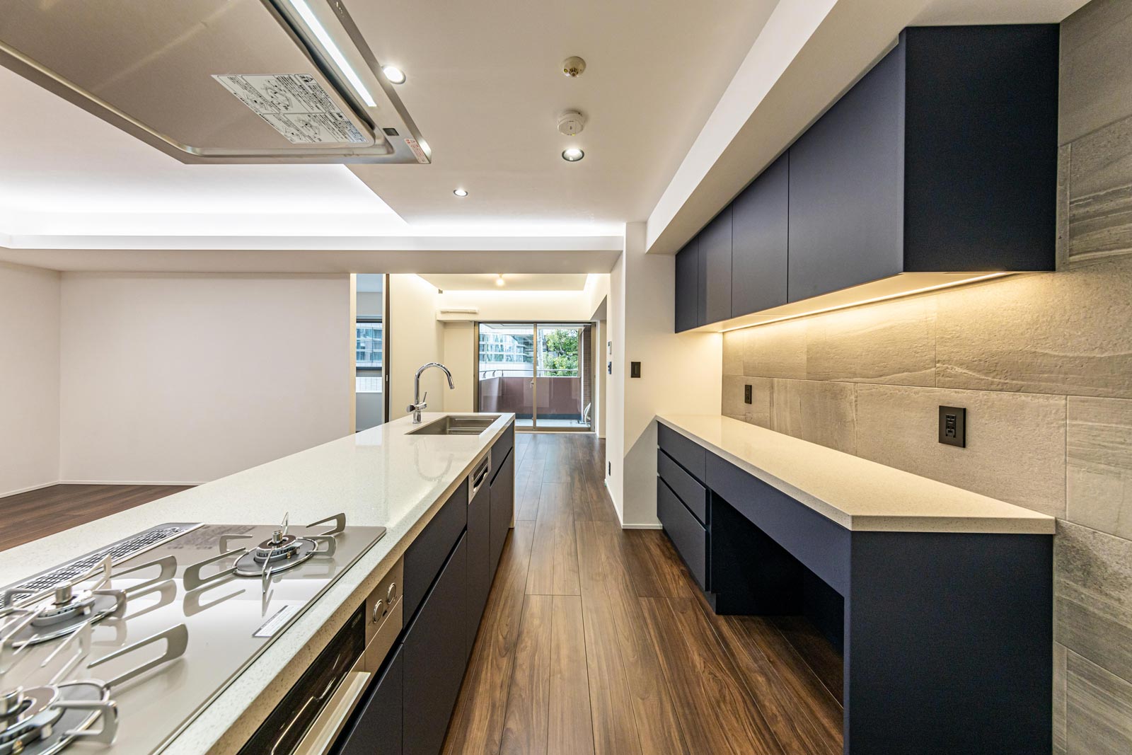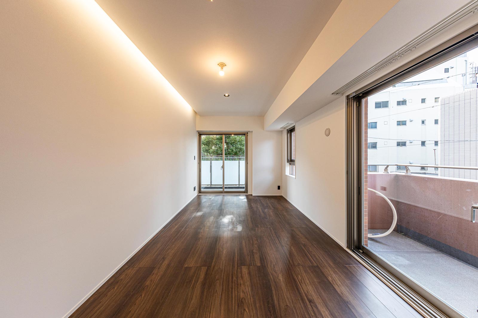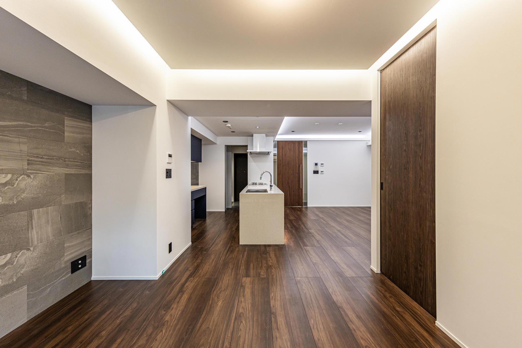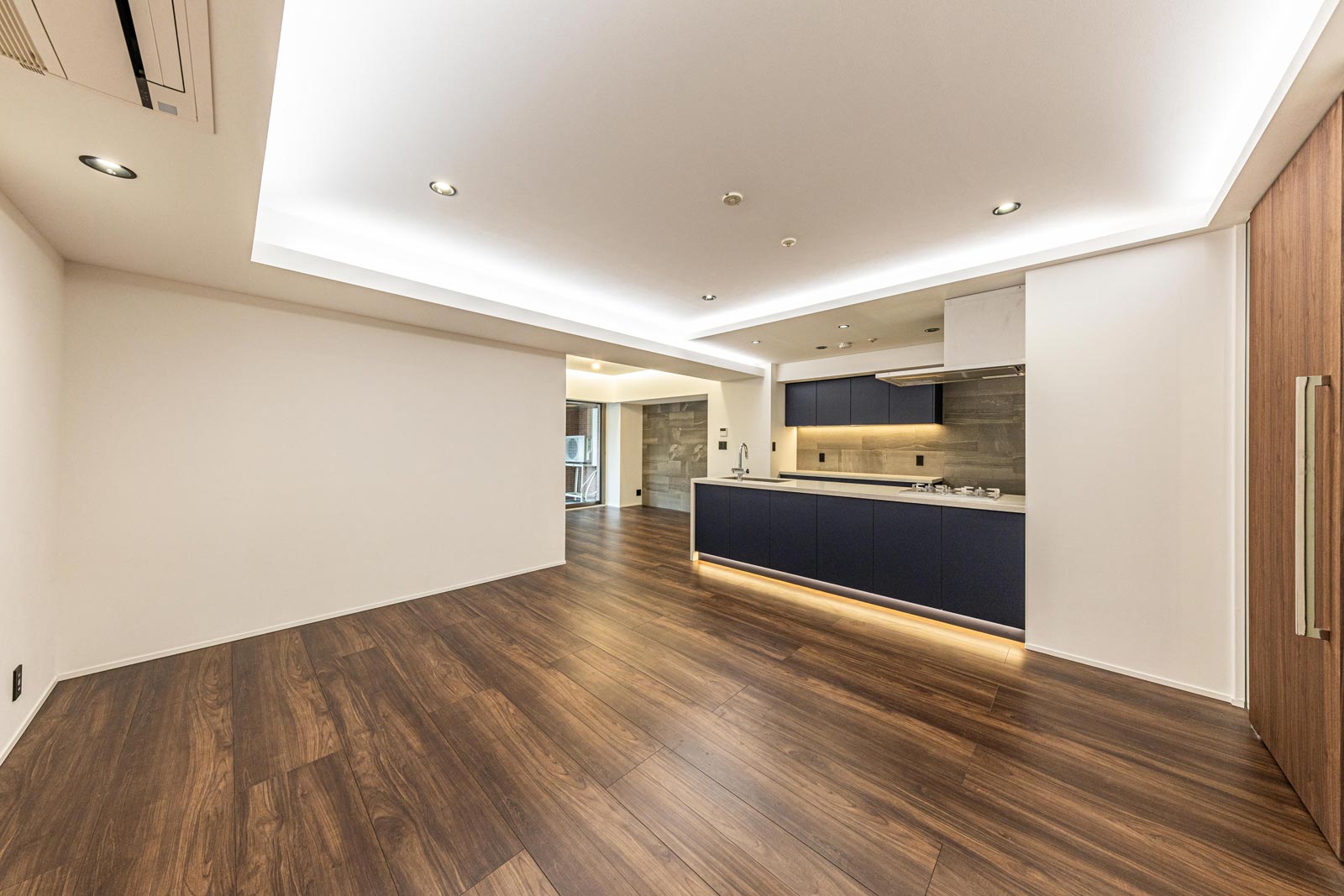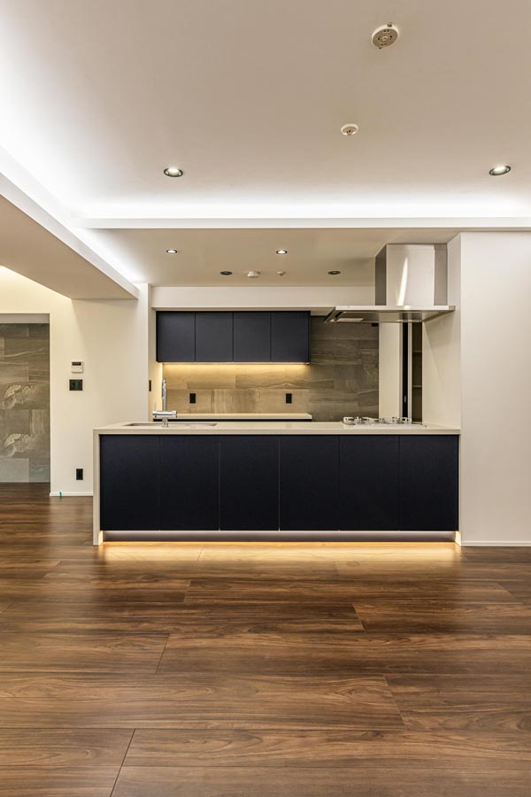 リビング・ダイニングは間接照明で空間の個性を際立たせ、個々の空間としても、1つの空間としても使うことが可能。