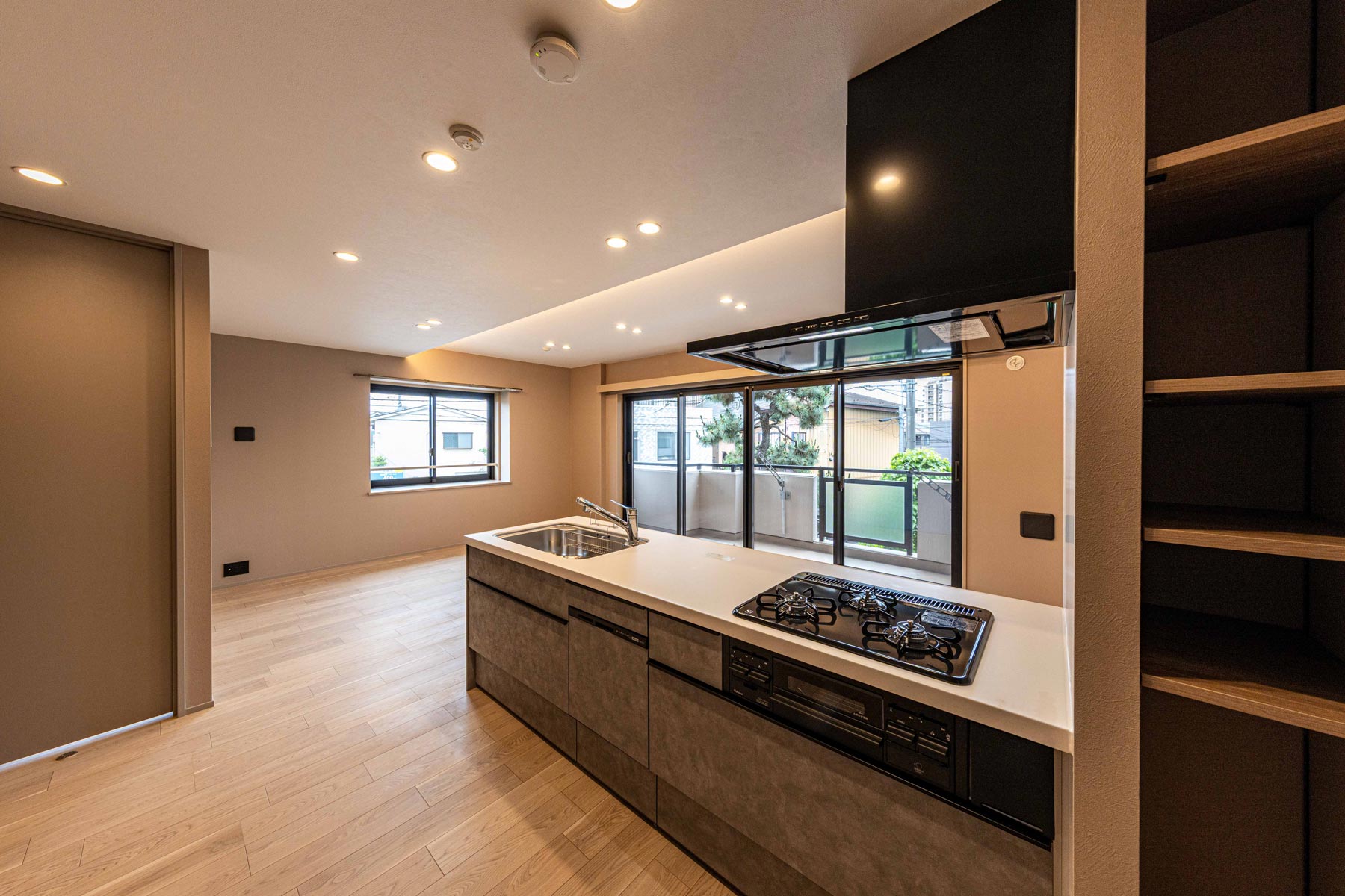 キッチンはリビングと調和するグレージュトーンのカウンタータイプ。落ち着きある色合いが空間を上質にまとめ、食洗機を備えるなど機能面も充実。美しさと利便性を兼ね備えた設計です。
