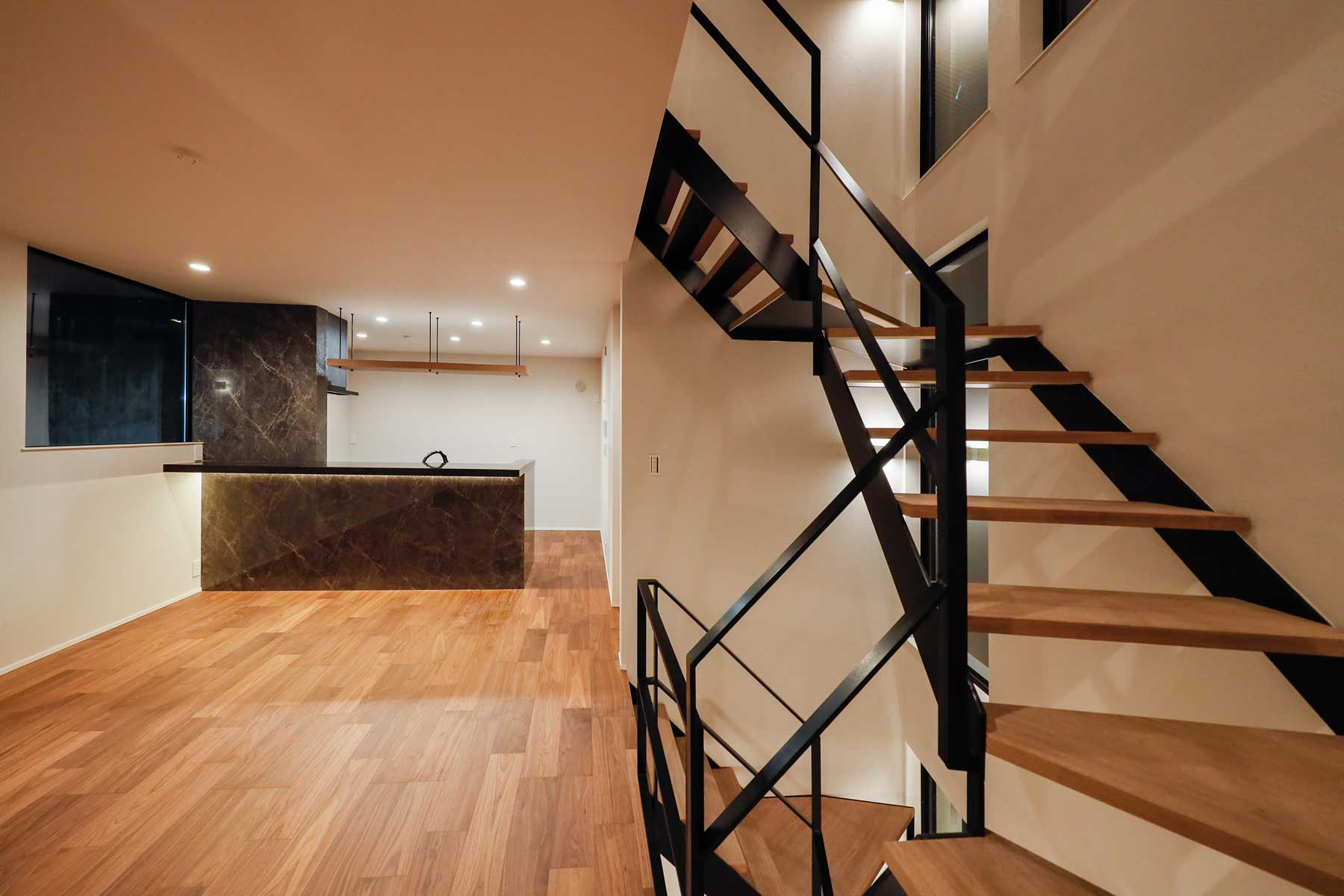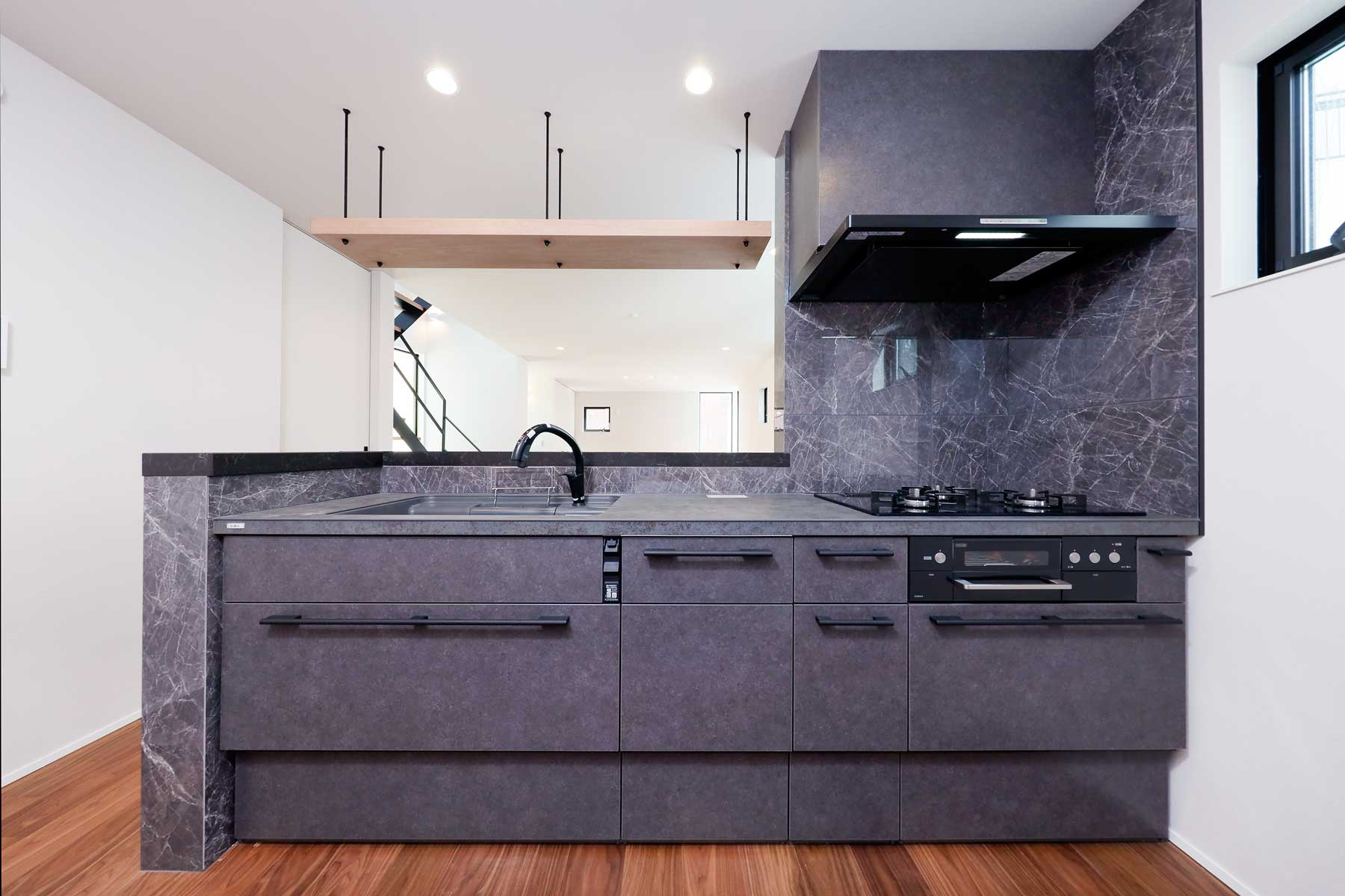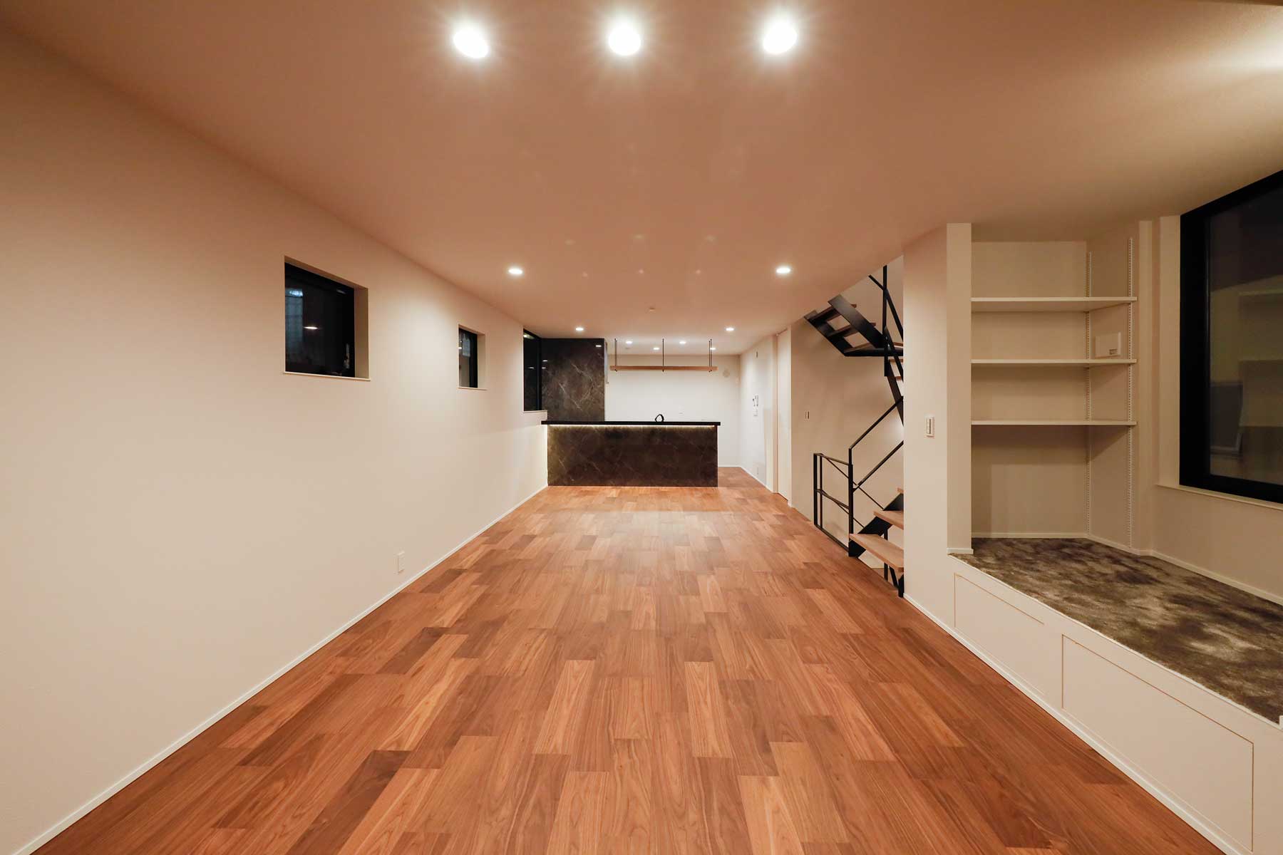 LDKには最新トレンドの「リーディングヌック」を取り入れ、快適なおうち時間を過ごせる工夫を。キッチンはタイル張りのカウンター裏に間接照明を組み込み、高級感あふれるバーのような雰囲気を演出。日常を特別なひとときに変えてくれる空間が広がります。