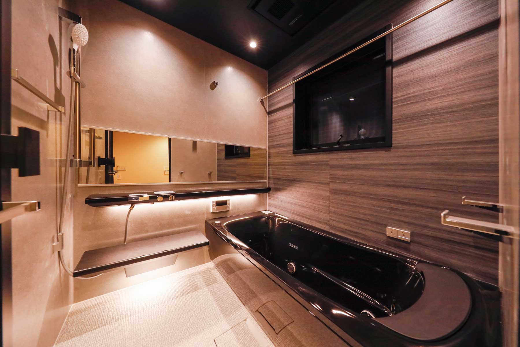 バスルームにはTOTOの高級ユニットバス「シンラ」を採用。浴室内の間接照明と、肩掛け湯が流れ出る仕様により、贅沢で心地よいリラックスタイムを実現します。