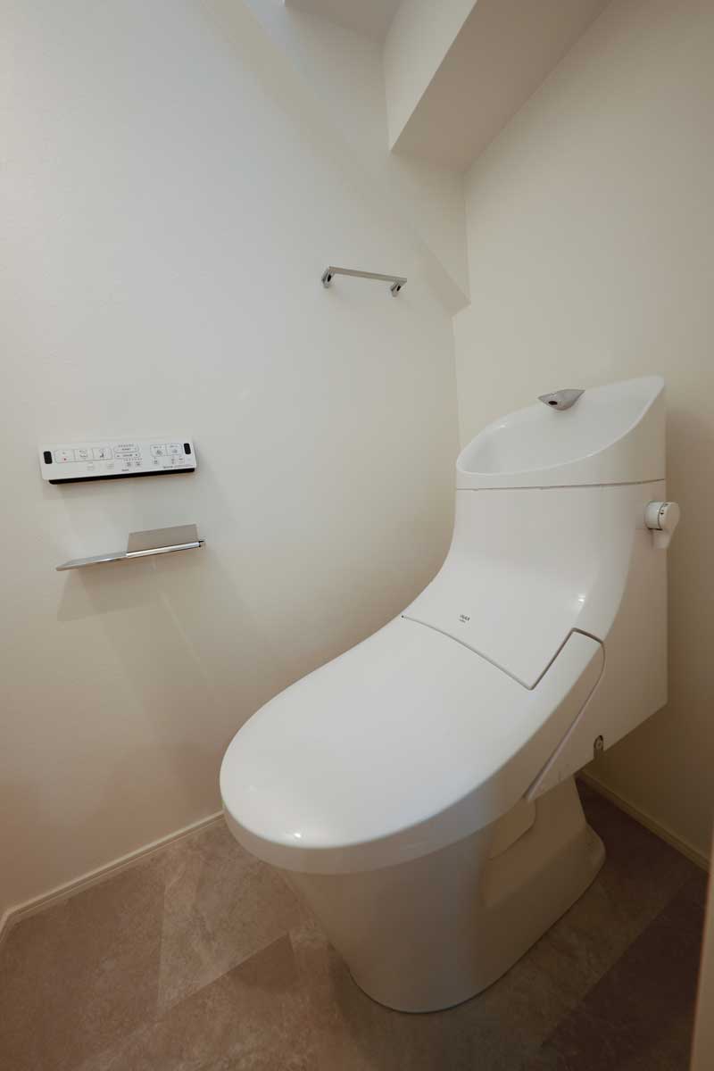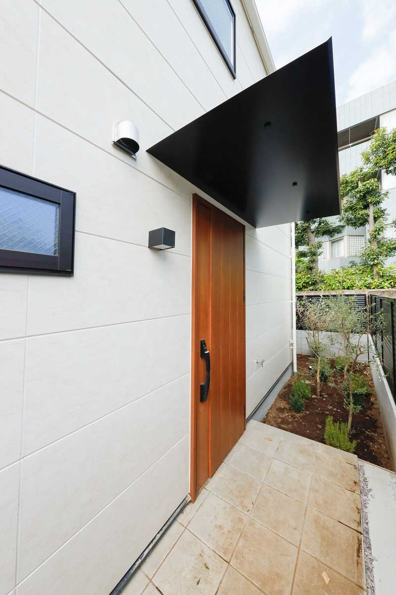 外観はホワイトを基調としたシンプルで落ち着いたデザイン。玄関には雨よけの屋根を設け、植栽の緑を添えることで、上品さとやさしい雰囲気を演出しています。玄関内部はホワイトとグレーを基調にスタイリッシュに仕上げ、鏡付きのシューズボックスを備えることで、身支度をスムーズに整えられる実用的な空間です。