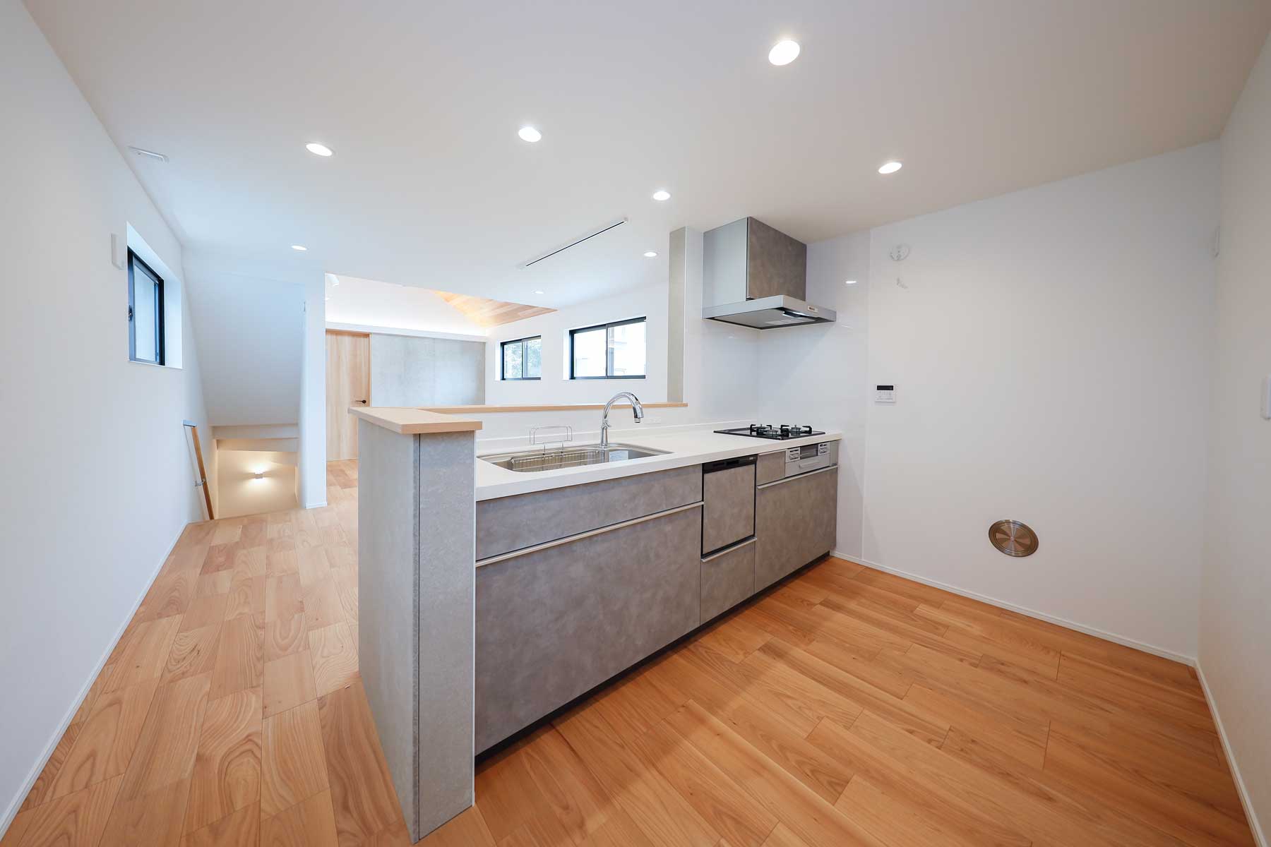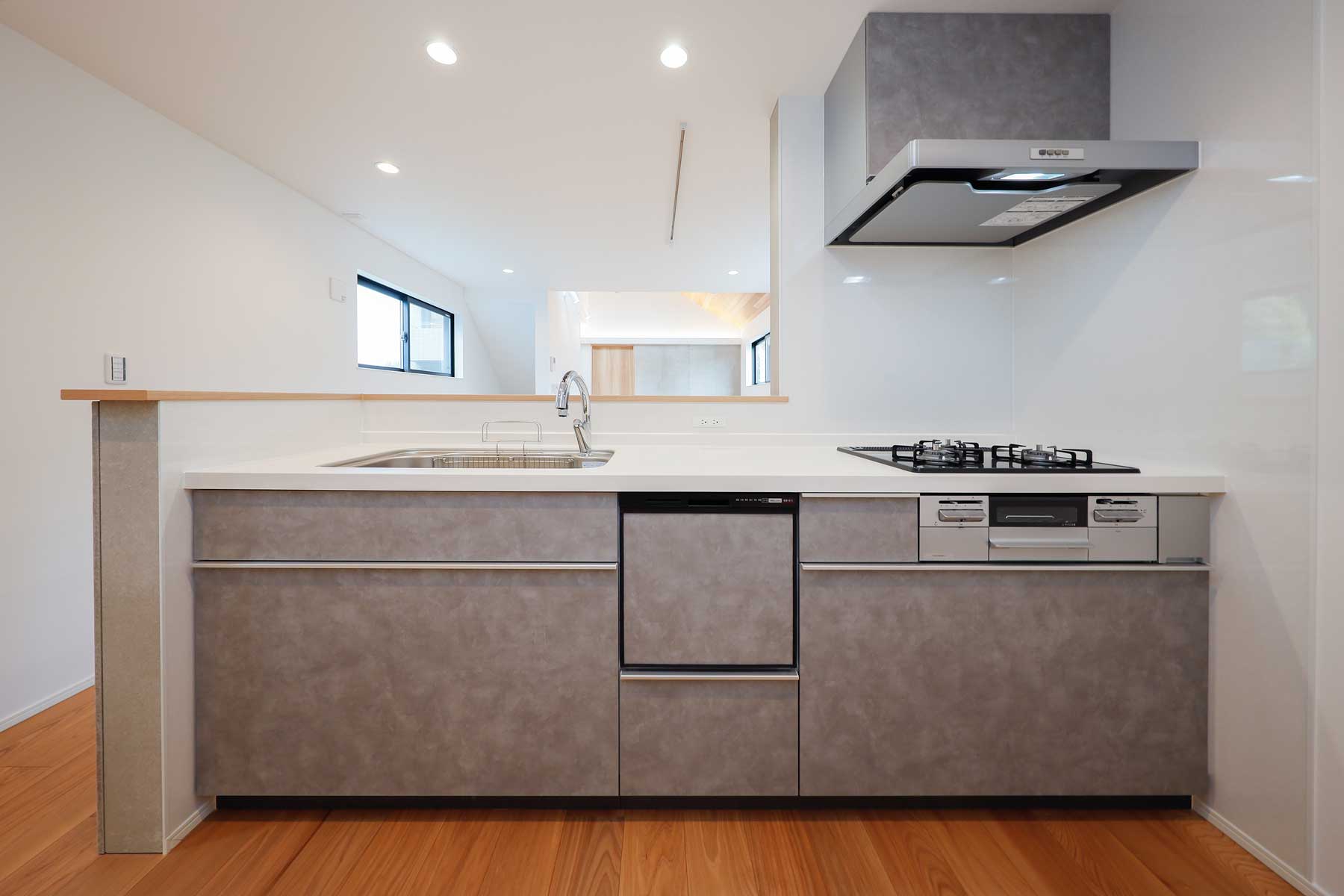 キッチンはグレーで統一したシンプルなカウンタータイプ。LDK全体に溶け込み、機能性も十分に備えているため、快適でストレスのない料理時間を叶えます。