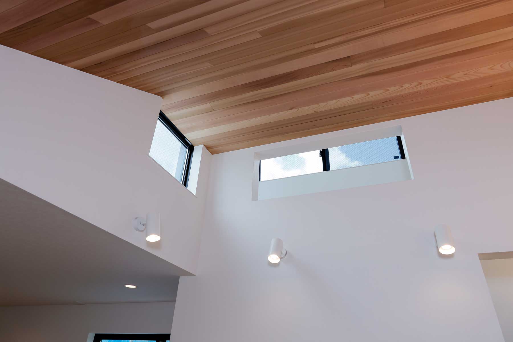 リビングは天井高を活かした開放的な空間に、小窓を多く設けて自然光をたっぷりと取り込みます。天井の間接照明が木材に反射し、温かみのある柔らかな印象を与え、昼も夜も心地よい雰囲気を楽しめます。
