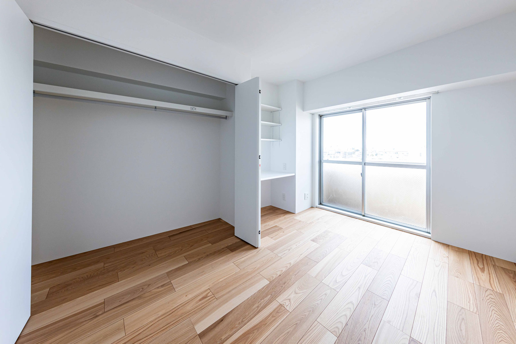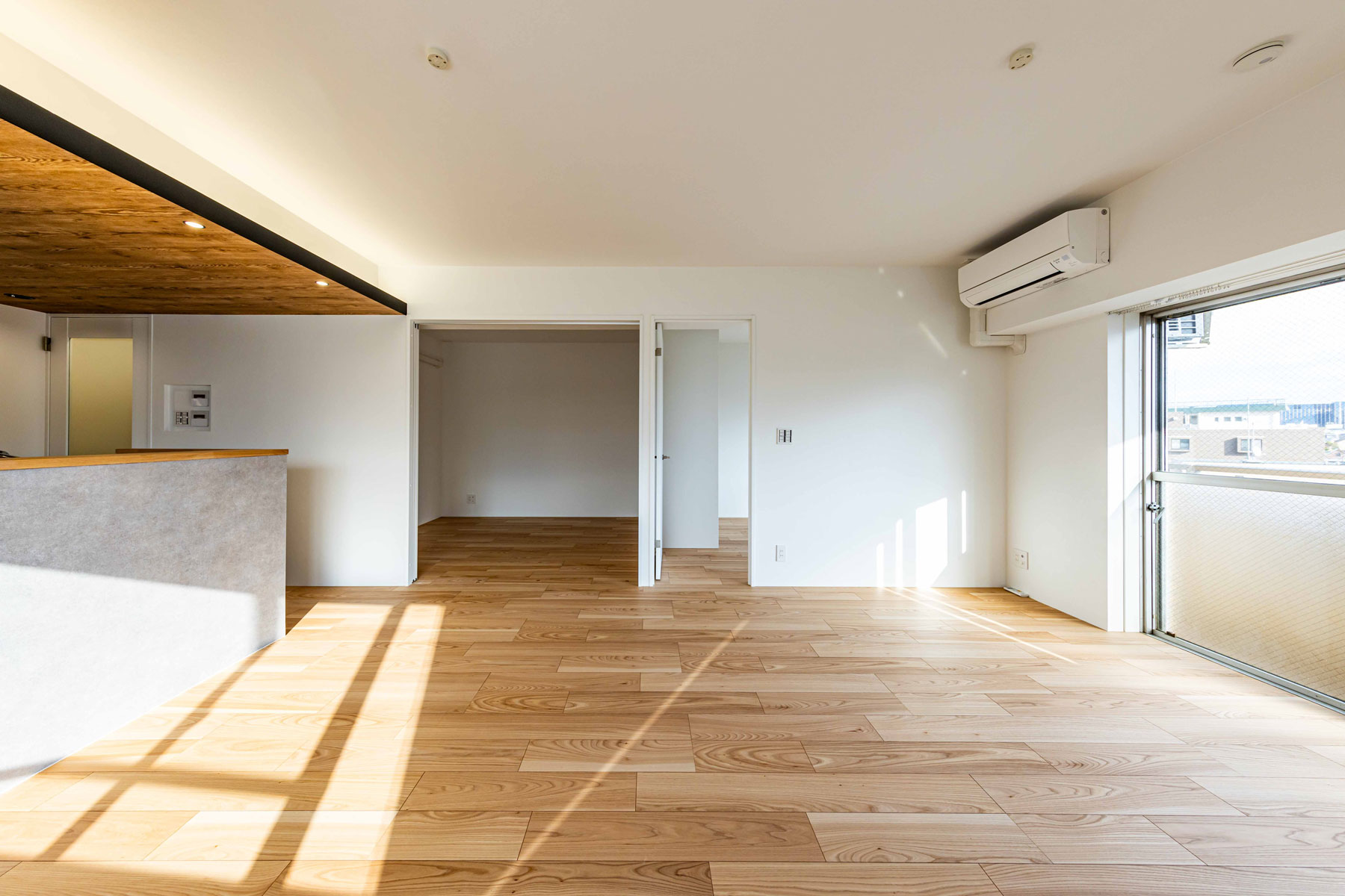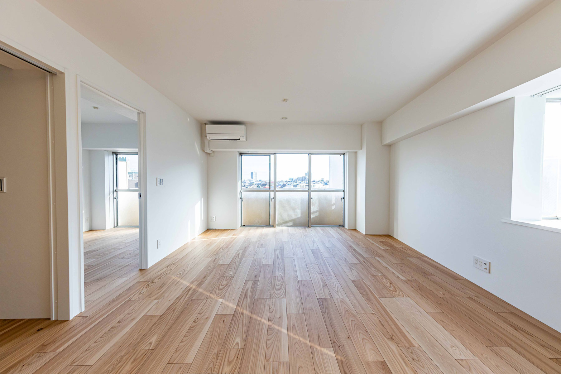 リビングの木目調フローリングと窓から差し込む柔らかな光が、ぬくもりを感じさせる空間を演出。