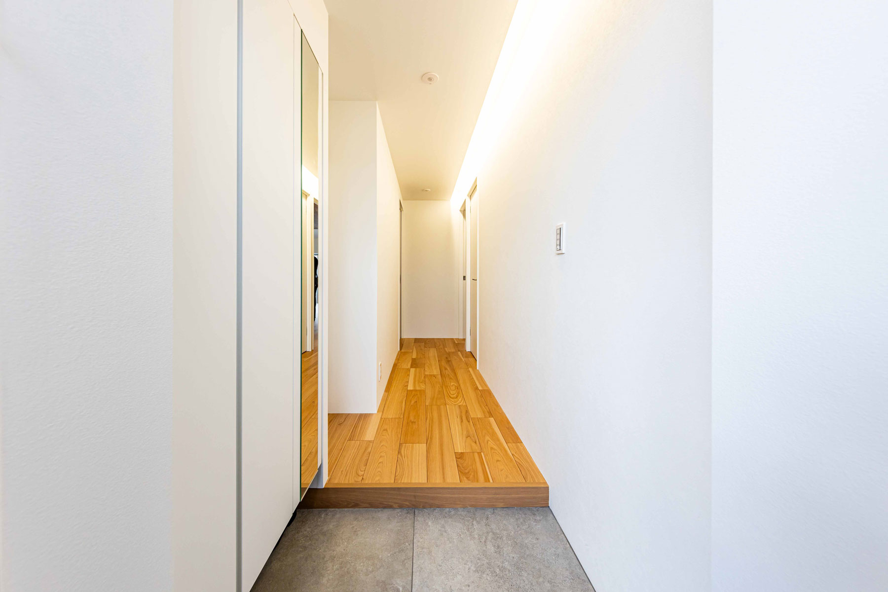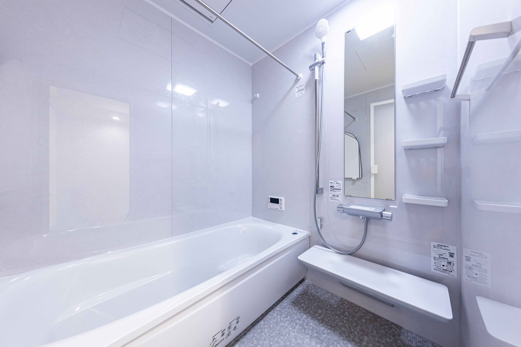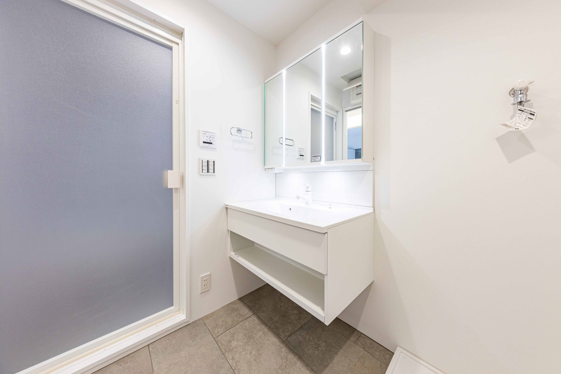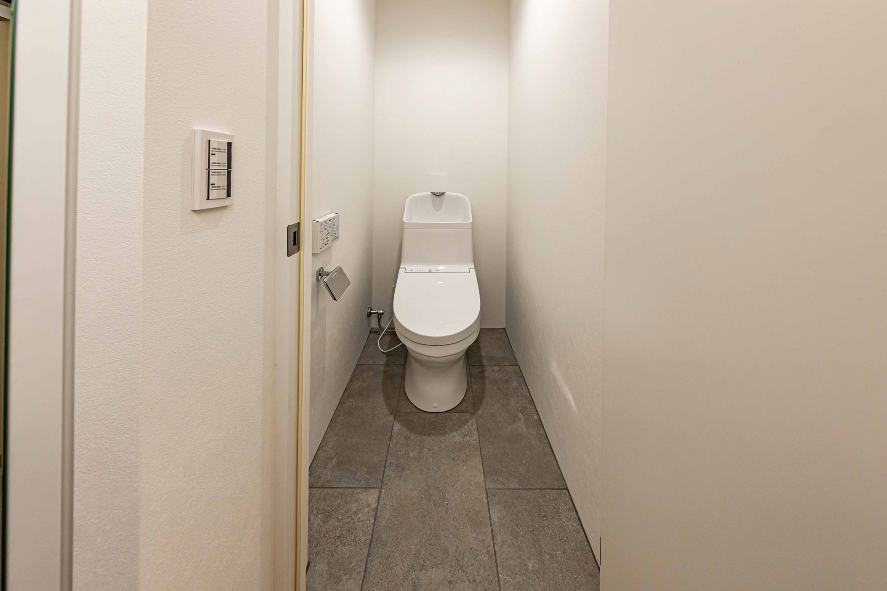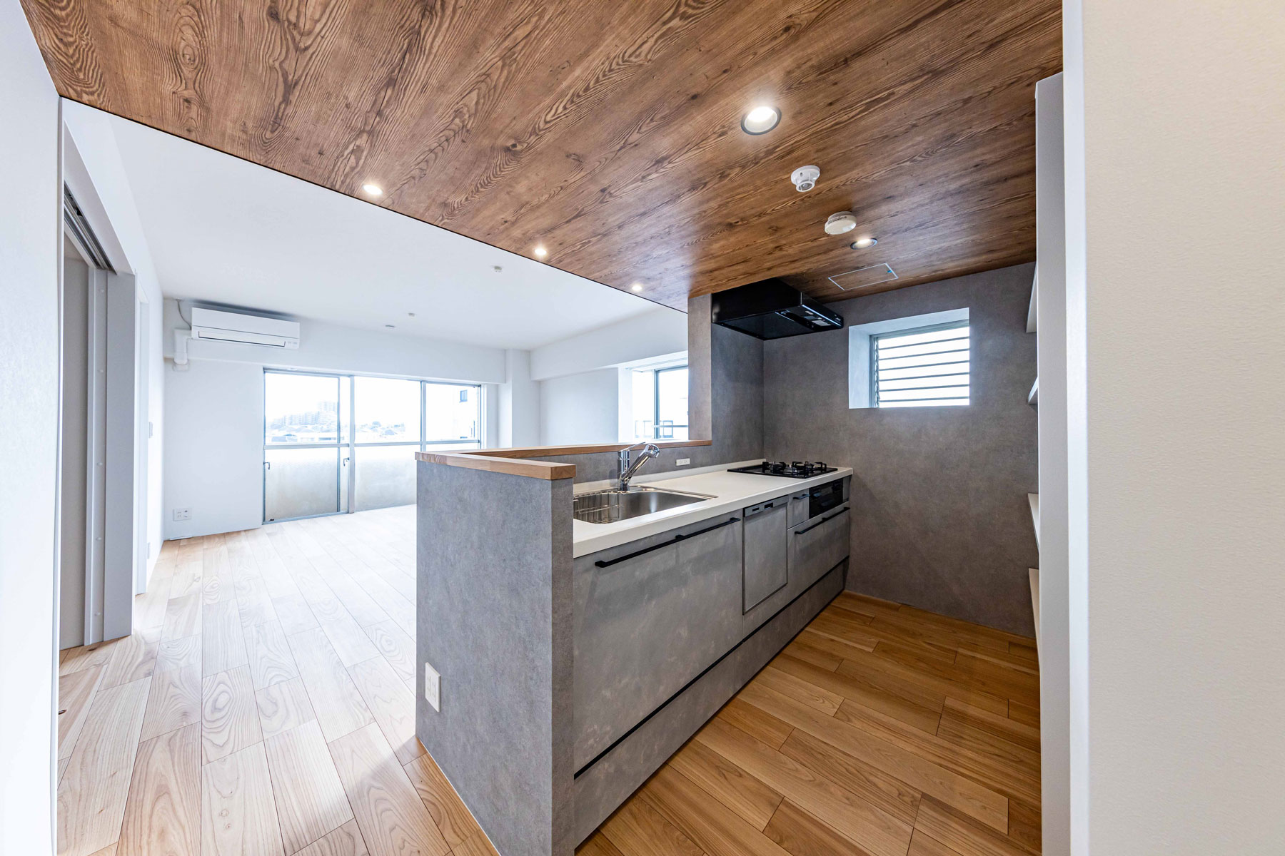 グレーカラーで統一したカウンターキッチンは、シンプルで洗練された印象を与えるとともに、天井高を抑えた設計に木目と黒フレームのコントラストが際立ち、まるでカフェのような落ち着いた雰囲気を演出します。背面には電子レンジやオーブントースターを収納できる棚や多数のコンセントを備え、使い勝手も抜群。デザイン性と機能性を兼ね備え、ストレスのない快適な料理時間を叶えます。