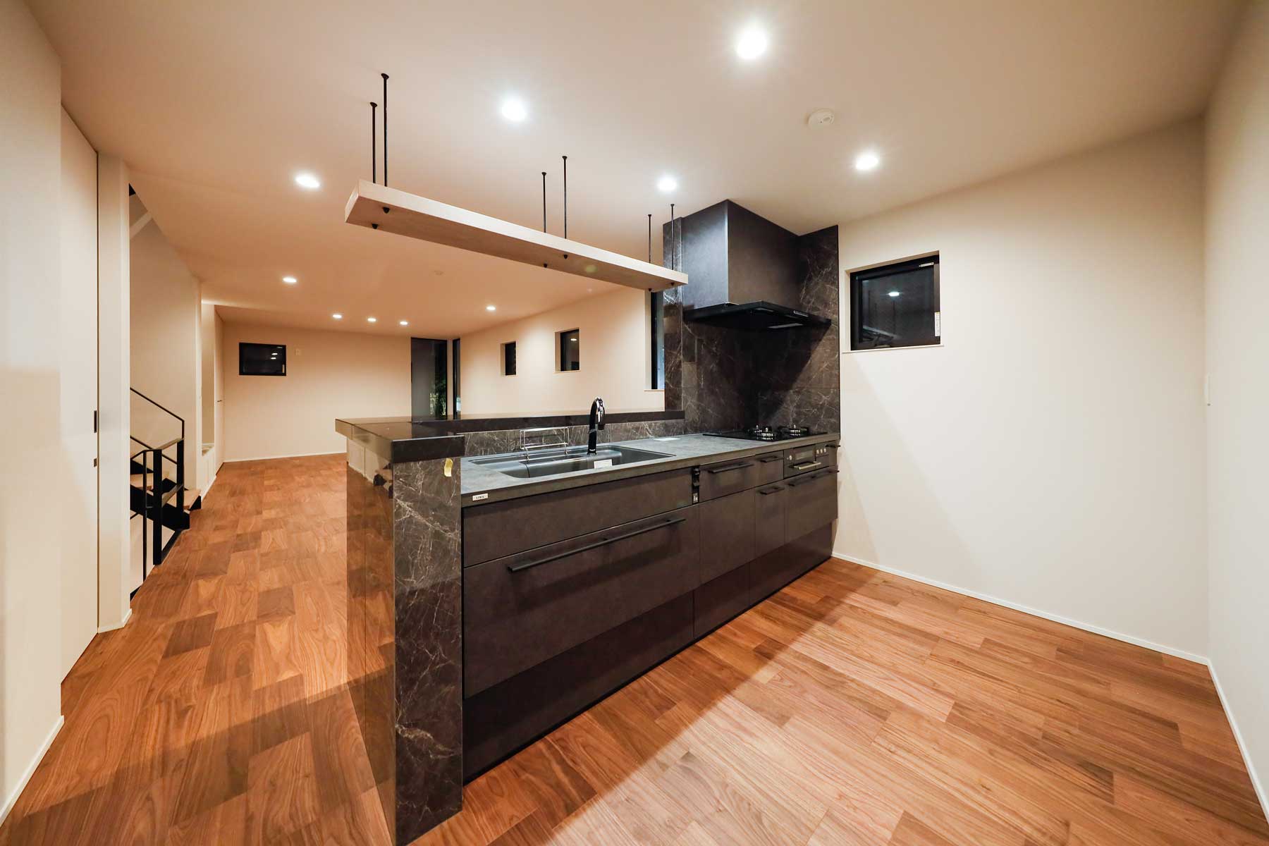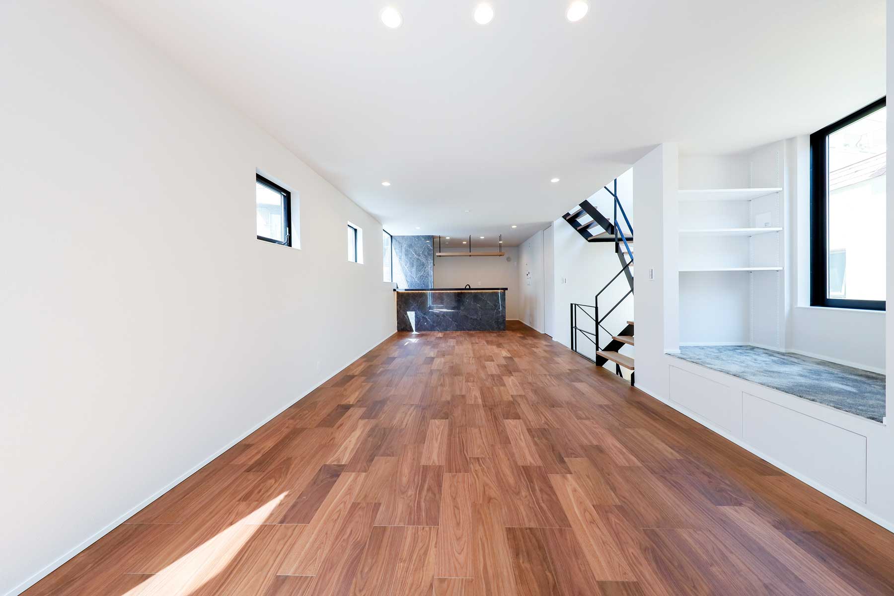 LDKには最新トレンドの「リーディングヌック」を取り入れ、快適なおうち時間を過ごせる工夫を。キッチンはタイル張りのカウンター裏に間接照明を組み込み、高級感あふれるバーのような雰囲気を演出。日常を特別なひとときに変えてくれる空間が広がります。