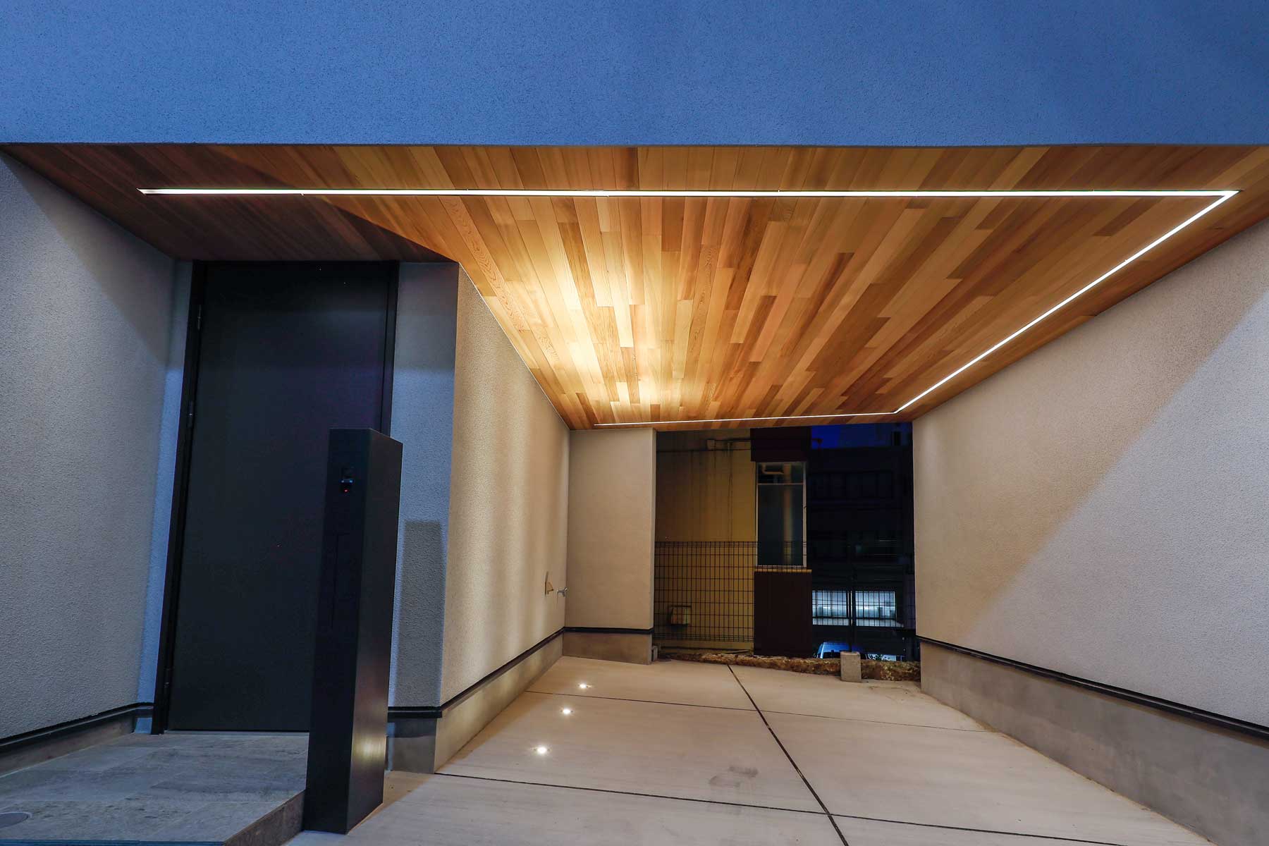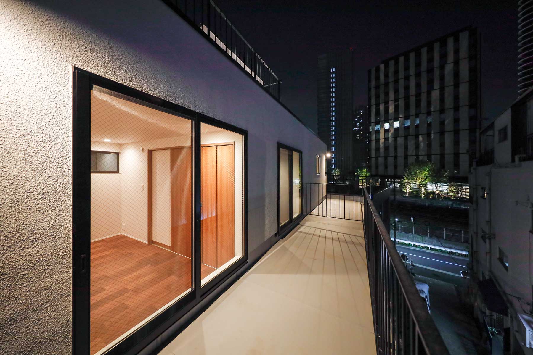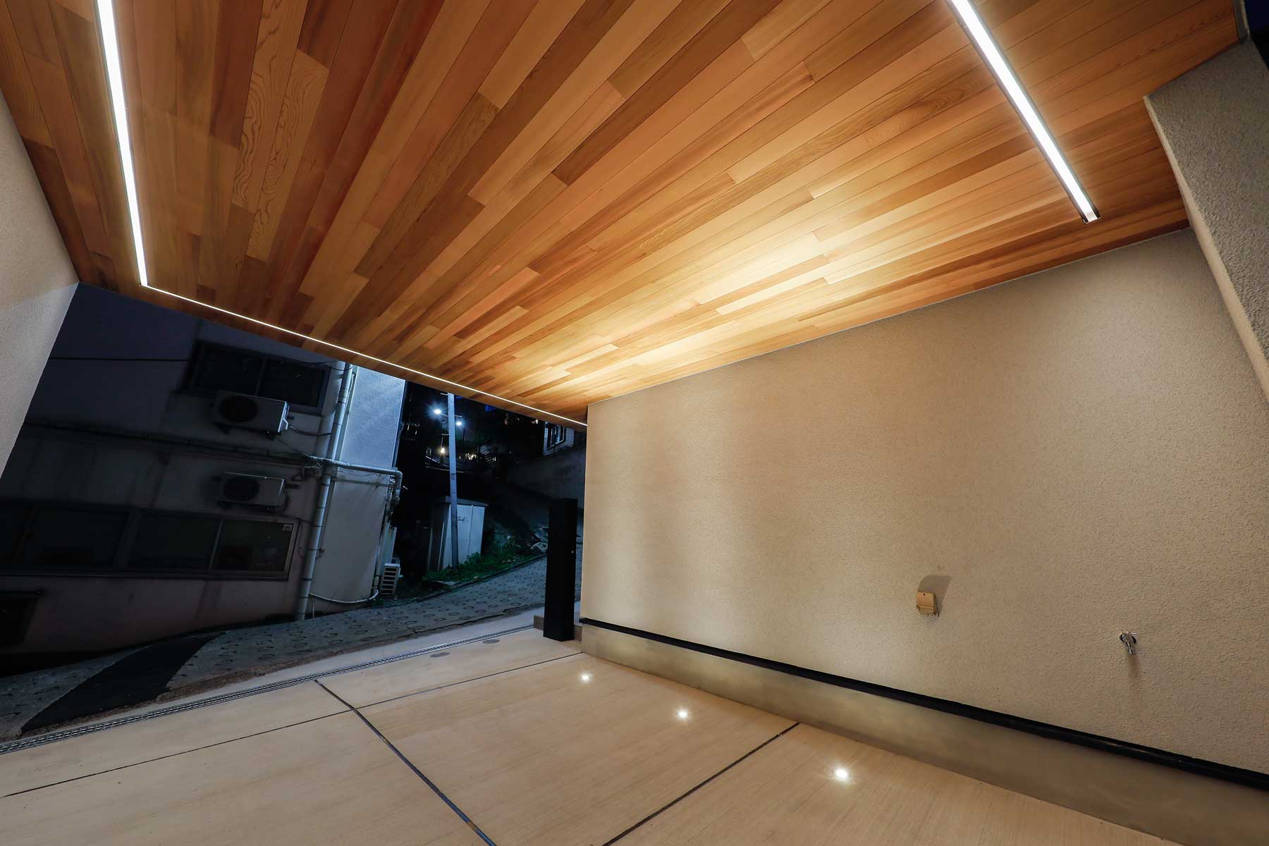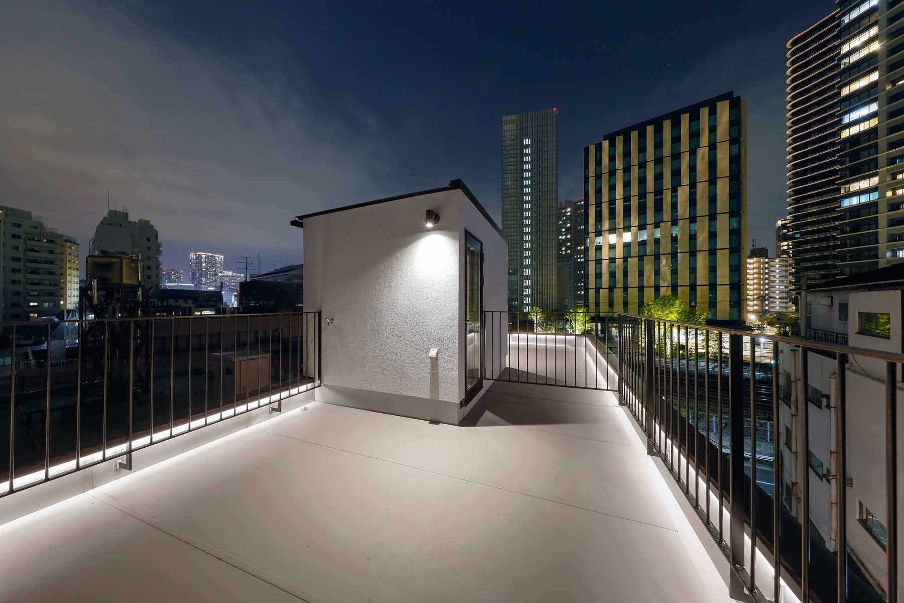 3階と屋上には大空間のルーフバルコニーを設け、パラペット部分にも間接照明を配置。ライトアップされた夜はヨーロッパのカフェテラスのような雰囲気に包まれます。全バルコニーには金属防水を採用し、永年メンテナンス不要かつ高い耐熱性を備えているため、屋上ではBBQや子供用プールなど、都心にいながら快適なアウトドア空間を楽しめます。