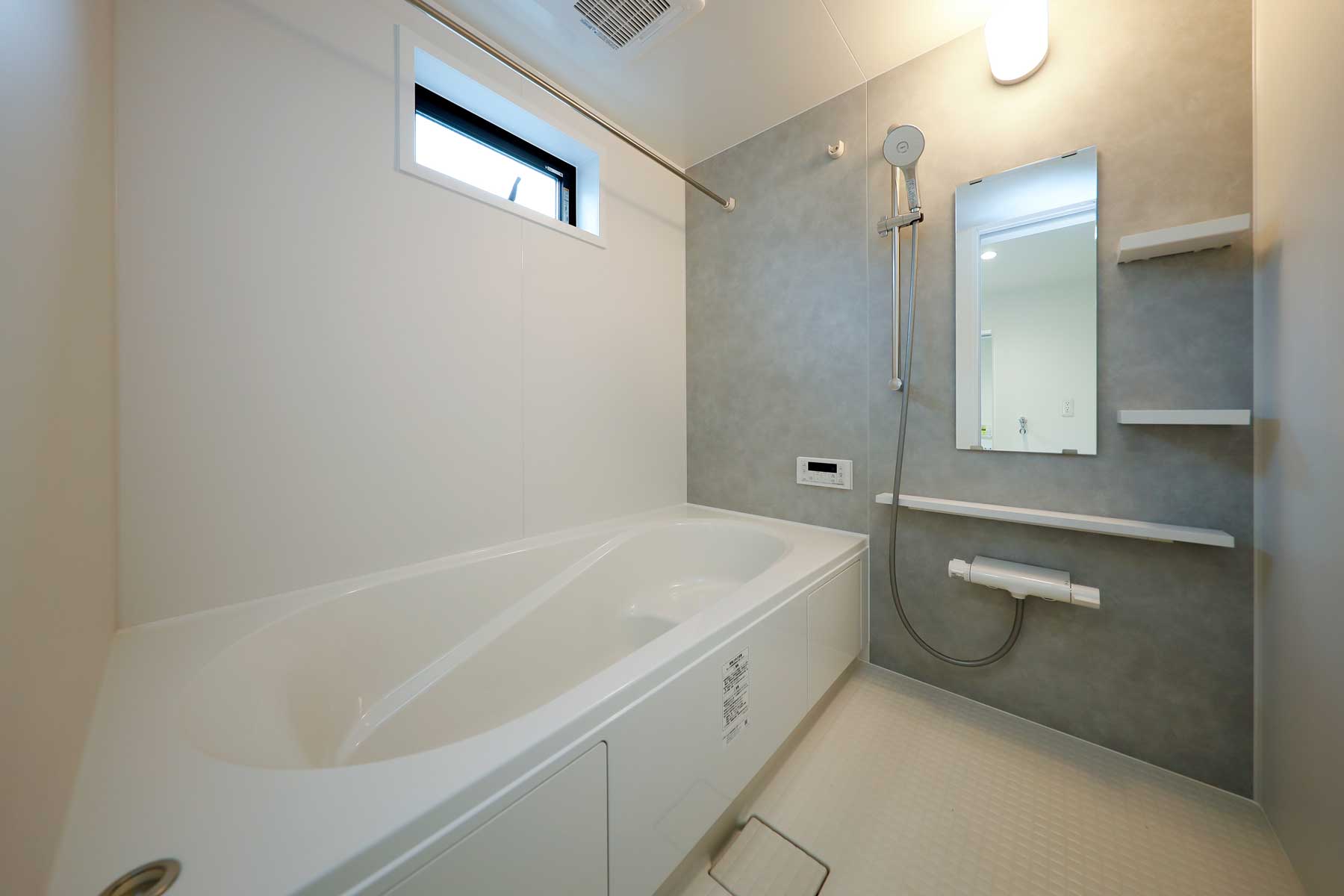 外観はホワイトを基調としたシンプルで落ち着いたデザイン。玄関には雨よけの屋根を設け、植栽の緑を添えることで、上品さとやさしい雰囲気を演出しています。玄関内部はホワイトとグレーを基調にスタイリッシュに仕上げ、鏡付きのシューズボックスを備えることで、身支度をスムーズに整えられる実用的な空間です。